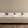 Vi har bevidst designet sengebasen lavere, da ekstra højde ikke nødvendigvis giver ekstra komfort – og i en familieseng er det vigtigere, at de små selv kan kravle ind og ud. Skulle det ske, at en af de små triller ud af senge, er faldet heller ikke så langt. Af hensyn til miljø og bæredygtighed bruger vi genanvendt skum og FSC-certificeret træ.