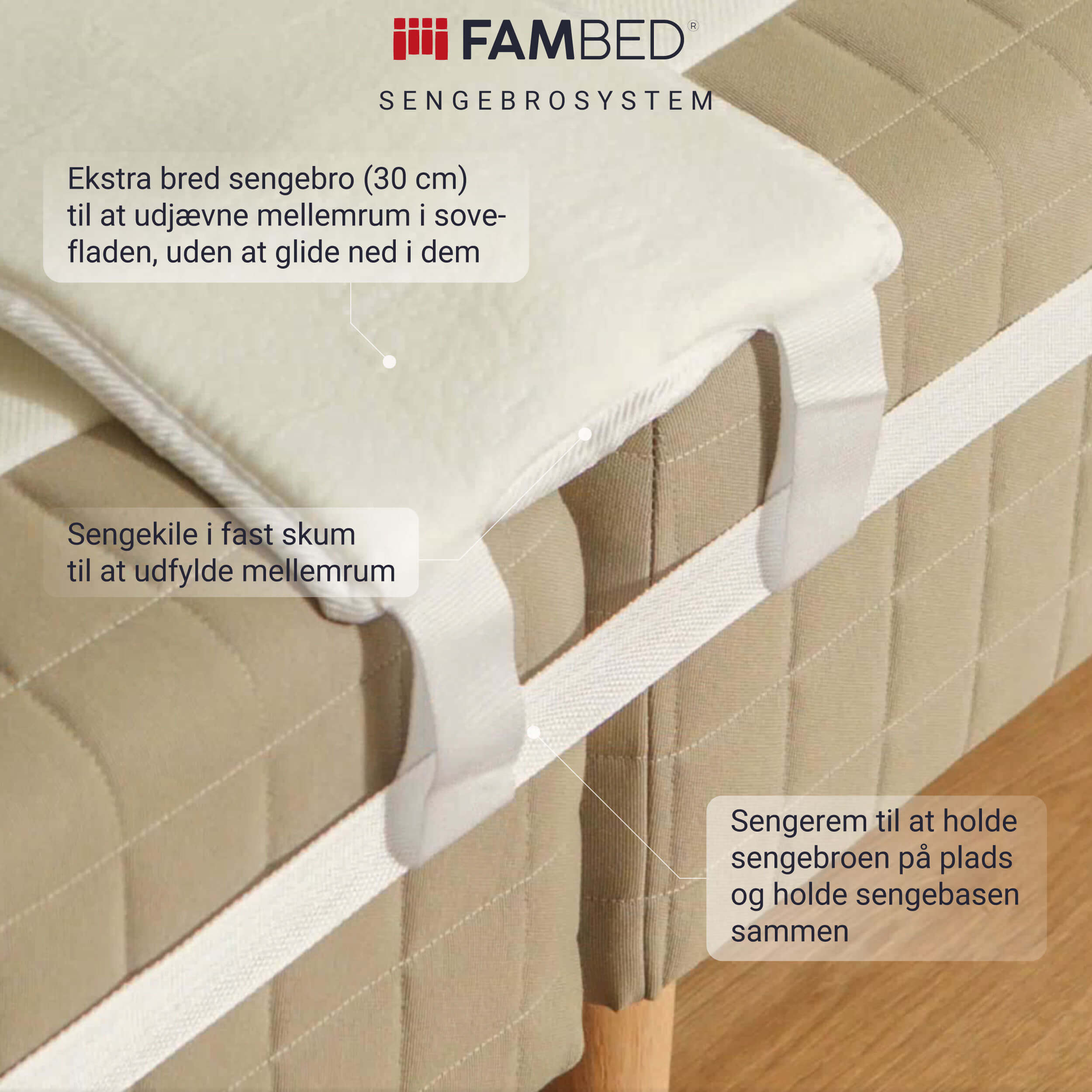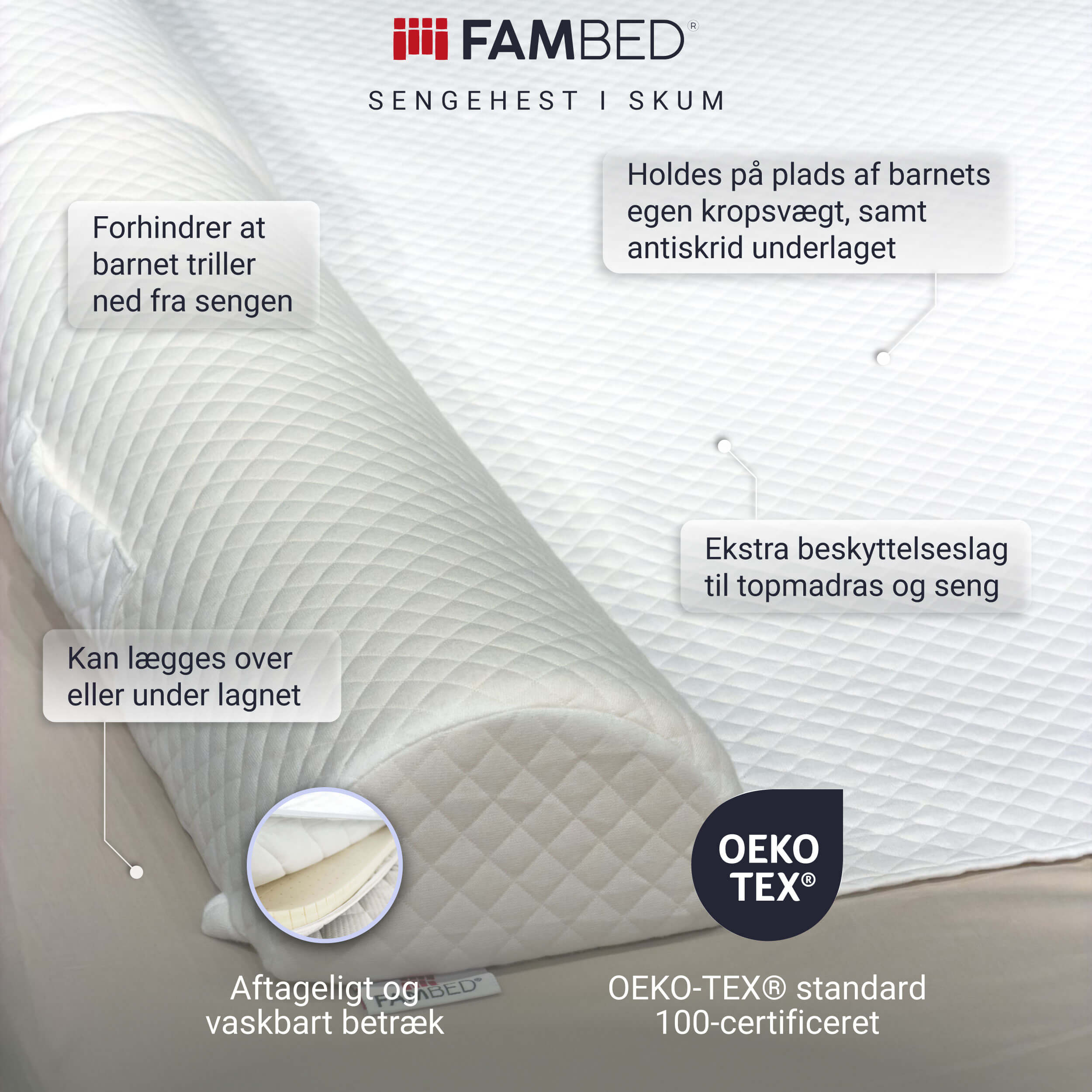 FAMBED® er produceret og designet i Danmark, med fokus på konfortabel og sikker Samsovning, udført i bæredygtige kvalitetsmaterialer (FSC og OEKO-TEX).